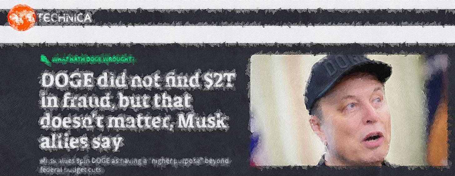 A headline in Ars Technica, on December 30, 2025, says: “DOGE did not find $2T in fraud, but that doesn’t matter, Musk allies say — Musk allies spin DOGE as having a ‘higher purpose’ beyond federal budget cuts”